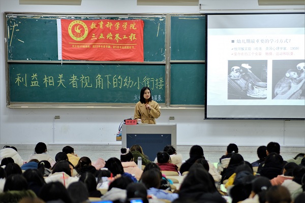 12月3日下午,好色tv 在9号教学楼302教室成功举办了以“利益相关者视角下的幼小衔接”为主题的三五讲座,此次讲座的主讲老师是杨晨晨老师,来自教科院的260余名学生参加了本次讲座。