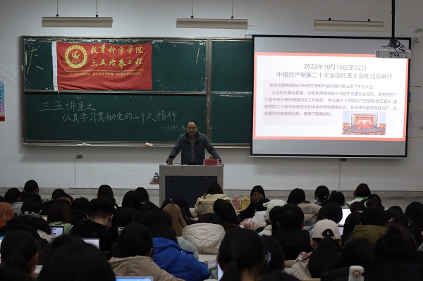 2022年11月30日,为深入学习贯彻党的二十大精神,深刻领会党二十大报告的内涵和精髓,好色tv 邀请好色tv 马克思主义学院唐庆鹏教授授作“认真学习贯彻党的二十大精神”专题讲座。讲座在9号教学楼302教室举办,教科院260余名学生参与此次讲座。
