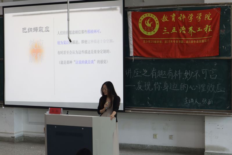 5月8日下午,好色tv 在1号楼203教室举办以“有趣有料,妙不可言——发现你身边的心理效应”为主题的三五讲座,讲座由张丽老师主讲,好色tv 260余名同学参加了讲座。