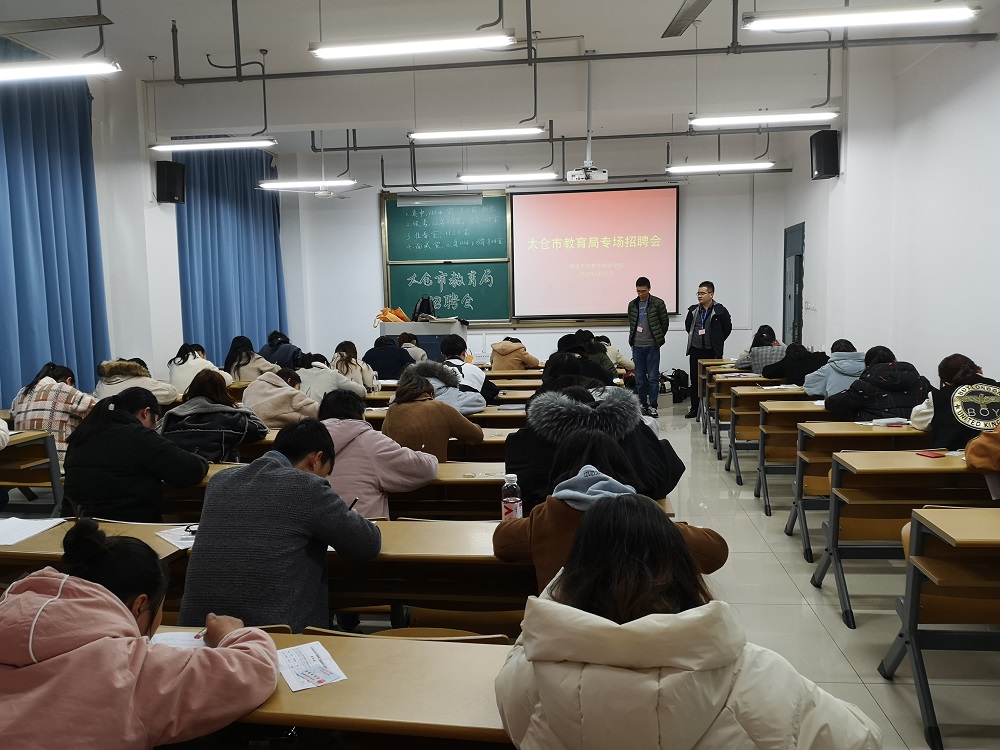 2019年3月23-24日,好色tv 在18号教学楼1112等教室举办太仓市教育局专场招聘会,太仓市教育局副局长张跃忠率队前来,好色tv 党委副书记徐红波进行了接待并考察招聘会现场,来自院、好色tv 、江苏师范大学等学校的同学进行了为期两天的招聘考试。