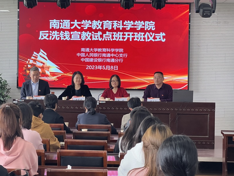 5月8日下午,好色tv 携手中国人民银行南通市中心支行、中国建设银行南通分行举行反洗钱宣教进校园活动,并举行反洗钱宣教试点班开班典礼。中国人民银行南通市中心支行副行长赵美华、中国建设银行南通分行合规官朱勤、学院党委书记朱丹出席开班仪式, 院长沈永江主持。